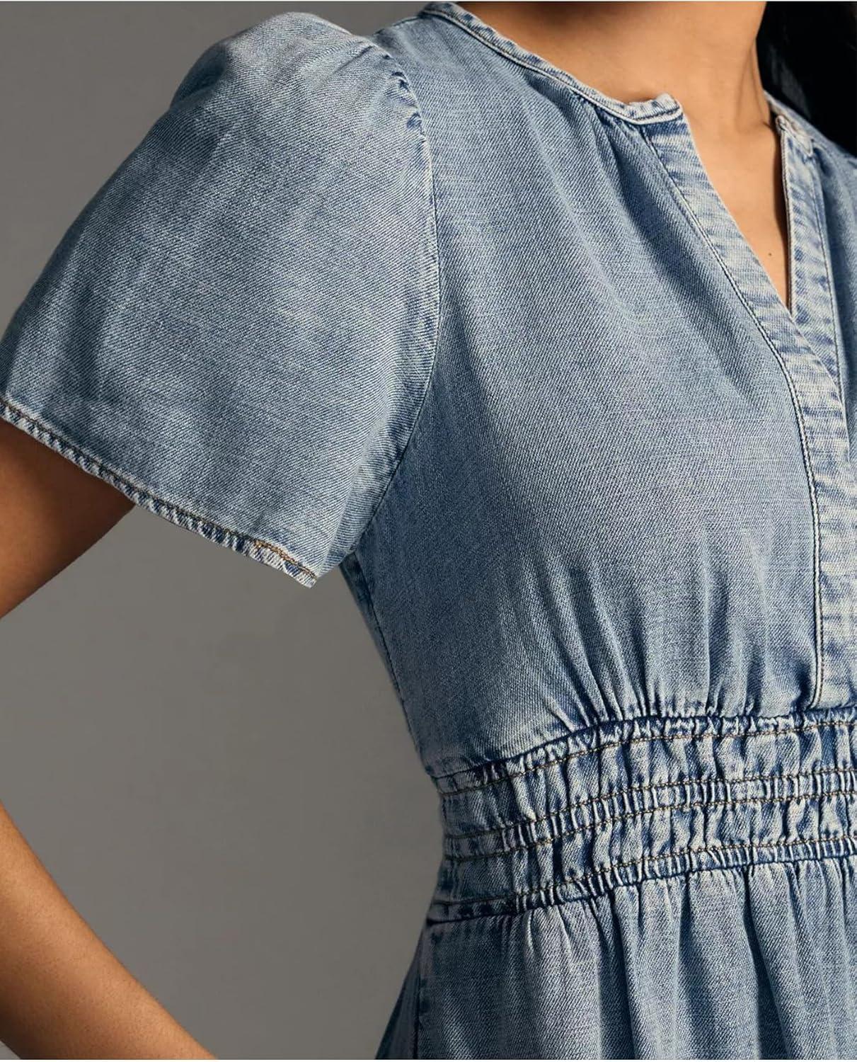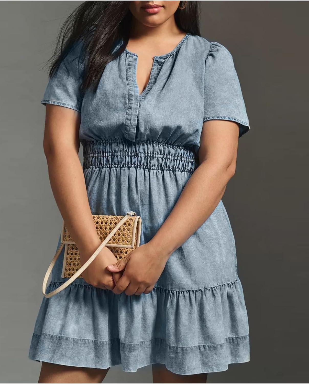For effortless daytime charm, pairing this dress with simple accessories is key. The soft, lightweight denim fabric and elasticated waist create a flattering silhouette that works great when combined with flat sandals or white sneakers for a casual, fresh look. Adding a knitted sun hat or a straw tote instantly elevates the outfit,making it perfect for a stroll in the park or a casual brunch. The deep V-neck and subtle ruffle details bring a touch of femininity, allowing the dress to transition easily from a relaxed day out to a casual summer gathering.