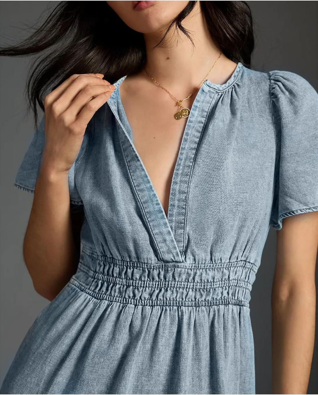 We recently had the chance to try out the Women’s Casual Denim Mini Ruffle dress in blue,and it promptly stood out as a versatile piece perfect for summer’s laid-back vibe. crafted from soft, lightweight cotton denim, this dress offers both comfort and breathability, while its elastic waistband gently accentuates the silhouette without feeling restrictive. The deep V-neck and subtle bubble sleeves add a touch of charm, making it easy to dress up or down depending on the occasion.Whether we paired it with sandals for a casual day out or dressed it up with accessories for a sunset gathering, the classic blue hue and ruffle details kept our look fresh and effortlessly stylish throughout.