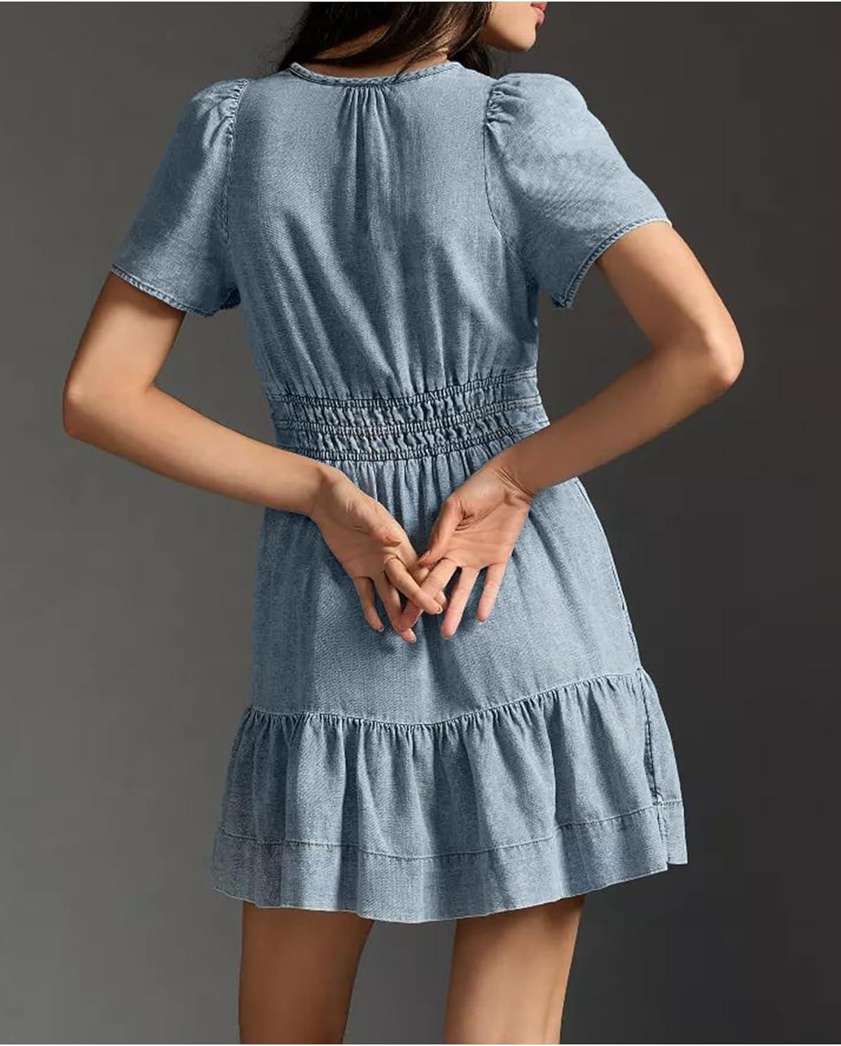 The deep V-neck instantly draws attention with its faux wrap design, offering a subtle yet alluring touch that refreshes the classic denim look.This neckline doesn’t just add charm-it also elongates the neck and frames the collarbone beautifully, creating a flattering silhouette from every angle. Complemented by the delicate ruffles along the neckline and hem, the dress balances femininity and casual ease perfectly, making it an ideal choice for summer outings or laid-back gatherings.