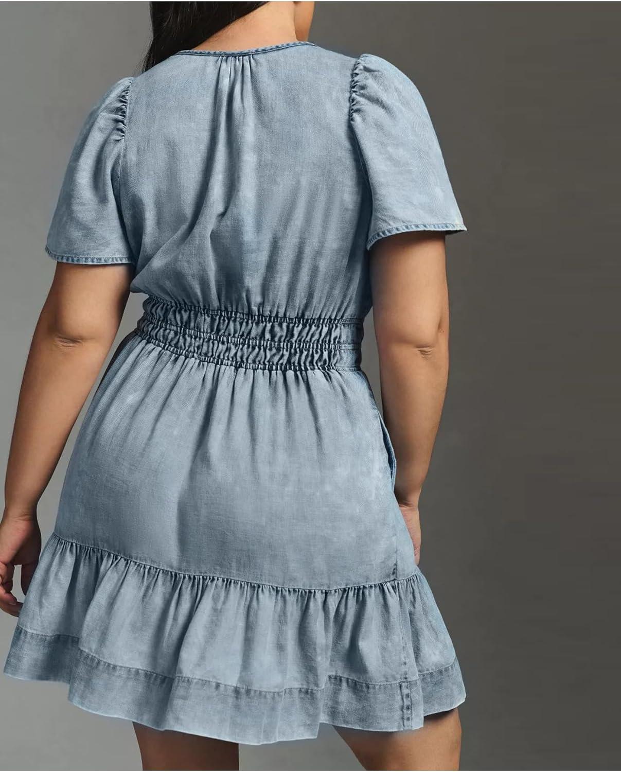 What we loved about this dress is its perfect blend of comfort and style. The soft, lightweight cotton denim fabric feels cool and breathable even on the hottest days, making it ideal for summer wear. The elastic waist is a genius touch, flattering a variety of shapes without feeling restrictive, while the subtle bubble sleeves and deep faux wrap V-neckline add just the right amount of charm and sophistication to an otherwise casual silhouette. The mini ruffle hem provides movement and a flirty finish that pairs effortlessly with sandals or a sunhat for those laid-back summer adventures. Plus,its classic denim blue shade ensures it never goes out of style,making it a versatile addition to any wardrobe.