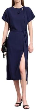 Women’s Office Ladies Chic O Neck Short Sleeve Belted Slit Drape A Line Dress