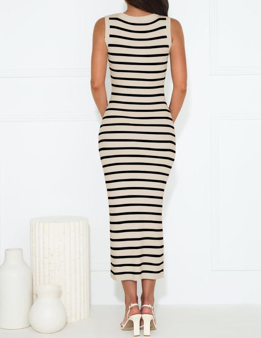 We found this dress impressively versatile, easily transitioning from a relaxed beach vacation look to polished everyday wear. Its sleeveless ribbed knit fabric offers breathable comfort for hot summer days, while the flattering bodycon silhouette and classic striped pattern add just the right amount of sophistication. whether paired with sandals and a sunhat for a stroll along the shore or dressed up with a light jacket and flats for casual office days, the dress maintains a stylish yet effortless vibe that adapts seamlessly to different occasions.